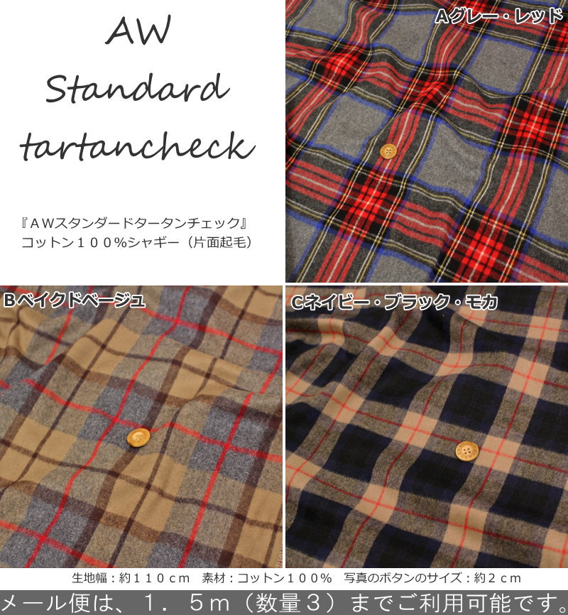 『AWスタンダードタータンチェック』コットン100%シャギー(片面起毛)素材:コットン100% 生地幅:約110cm男の子/女の子/キッズ/ベビー/大人/ウェアー/小物/ハンドメイド/手作り/